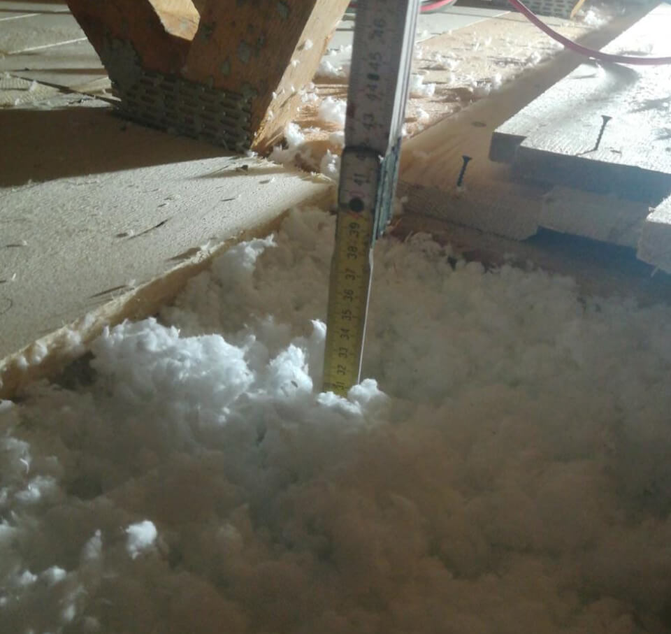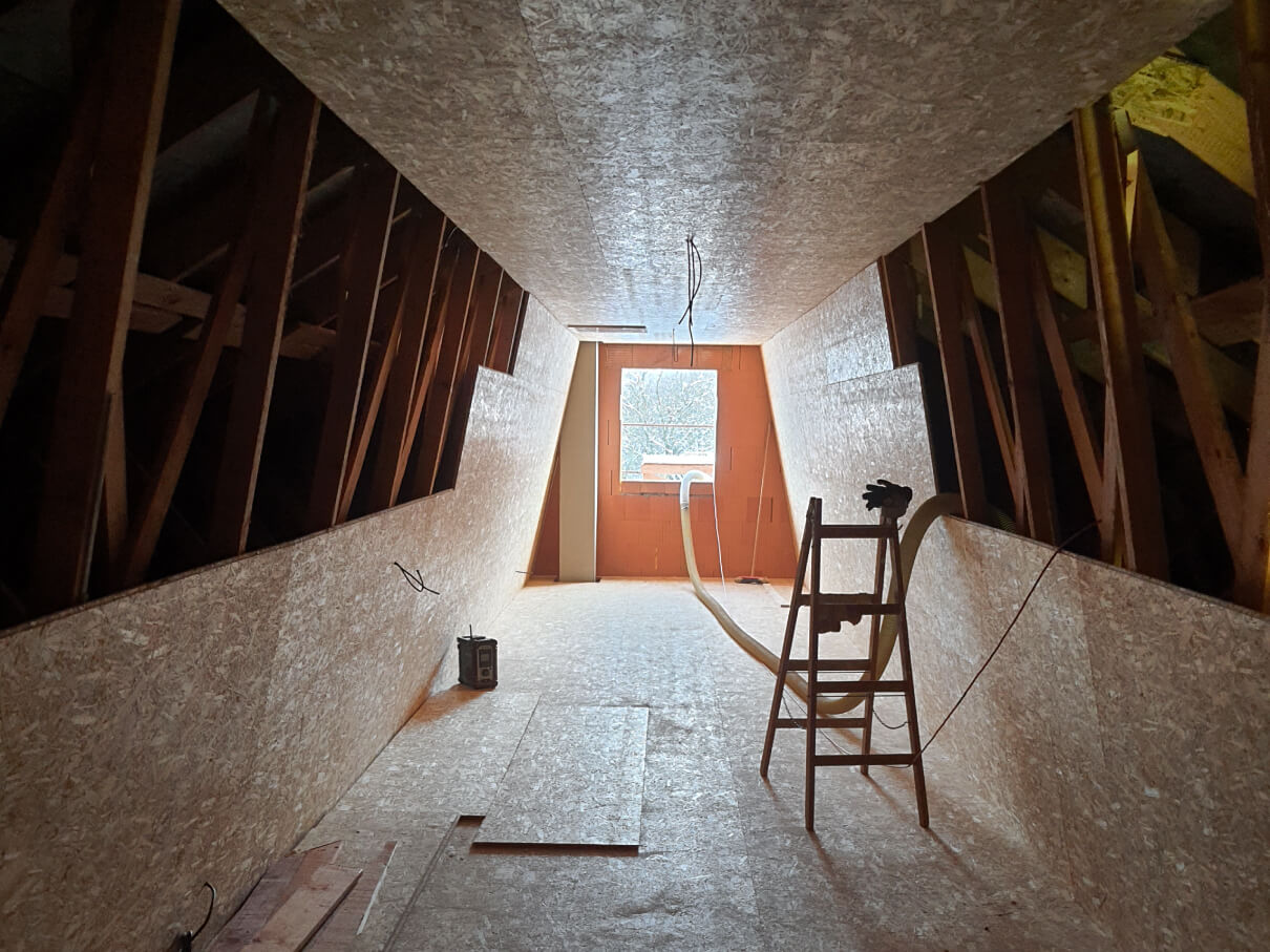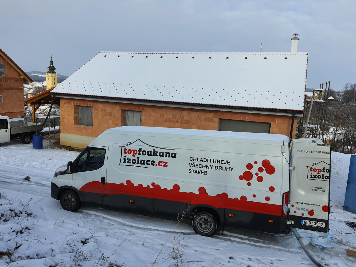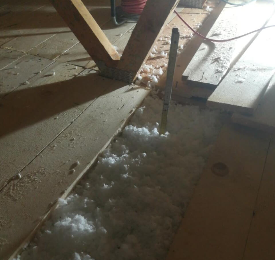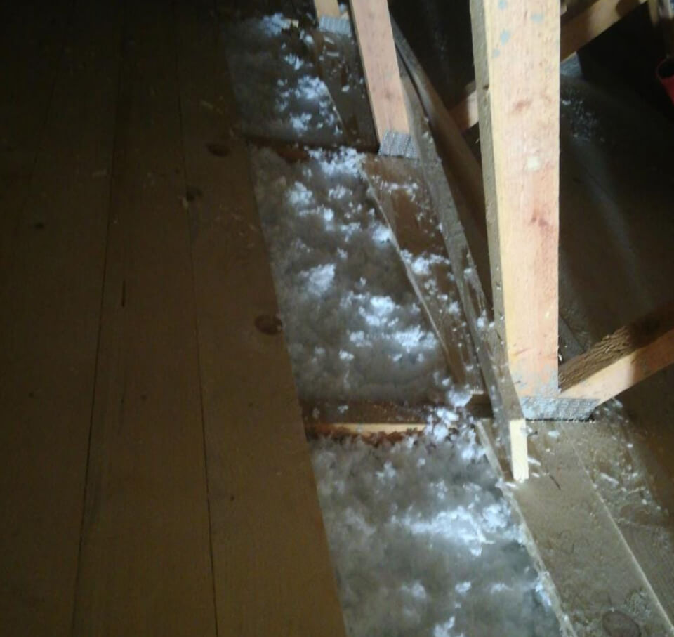 Konstrukce: foukáno mezi sdk strop a pochozí podlahu z časti zaklopenou z osb a části volně loženými prkny