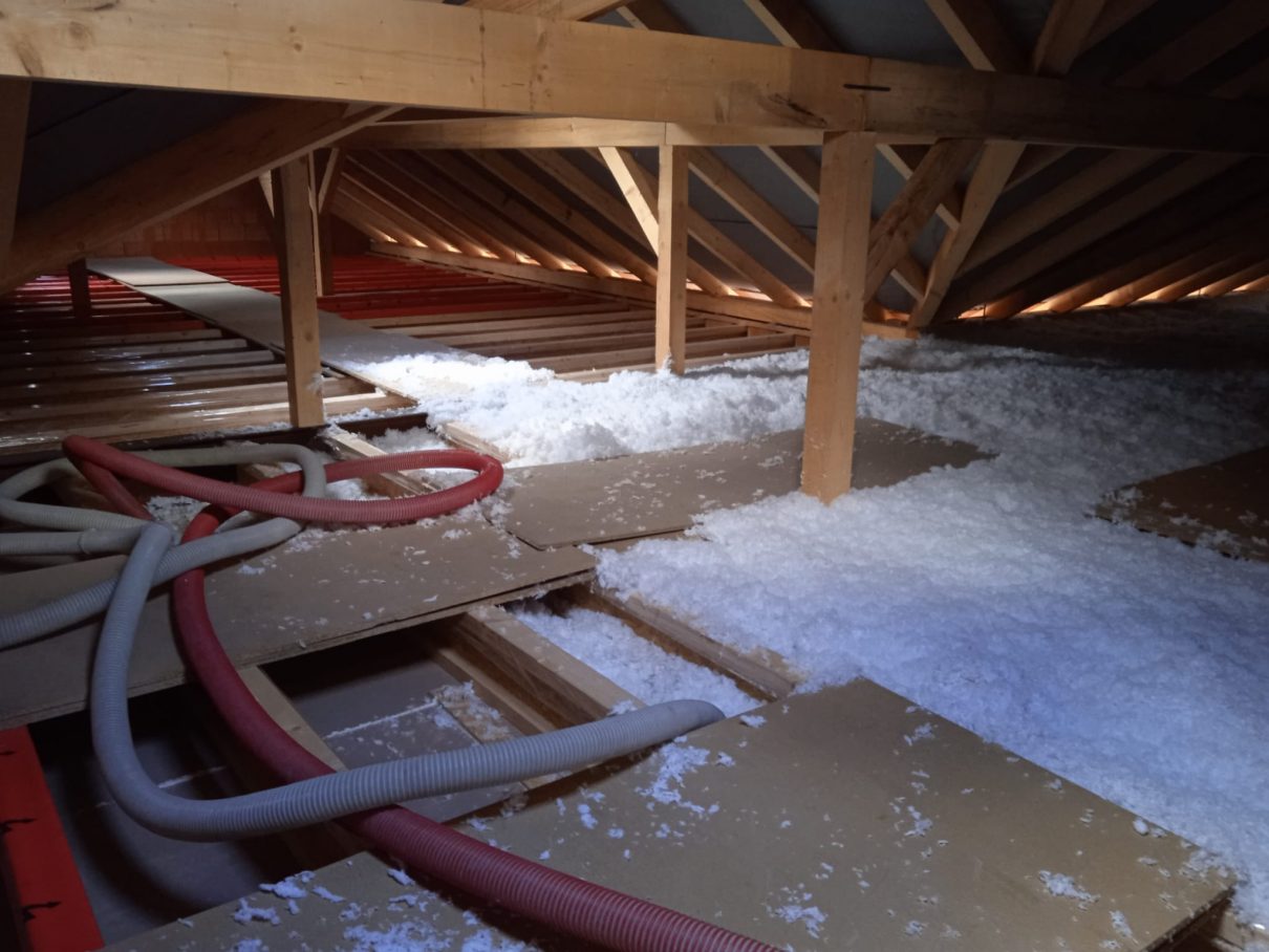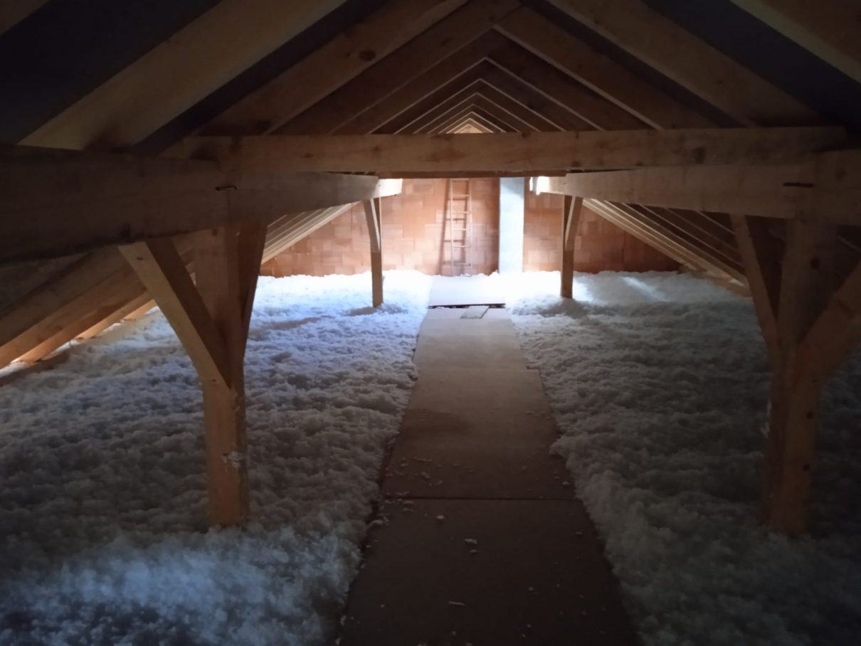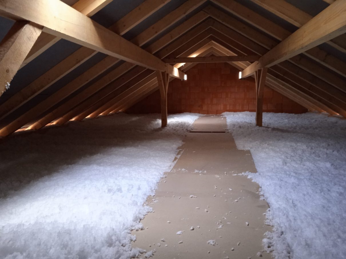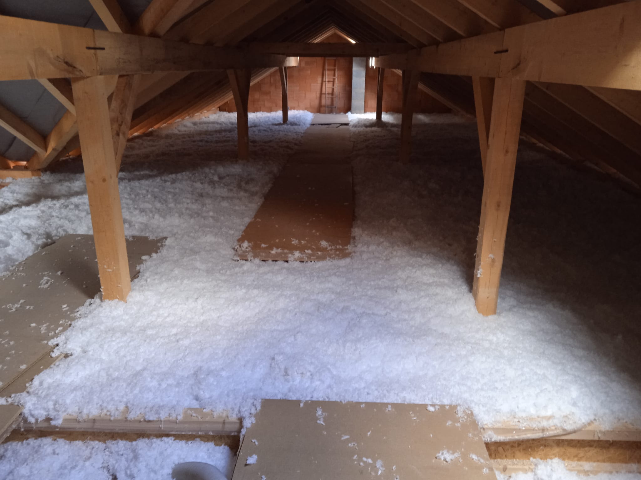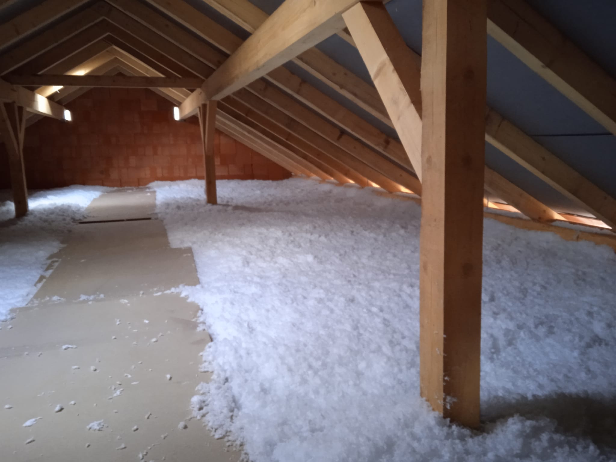 Realizátor: Palco s.r.o. Akce: Materiál: Knauf Supafil Loft 045 Konstrukce: strop z I-nosníků Výměra: 230 m2 Aplikovaná tloušťka: 280 mm , 64 m3